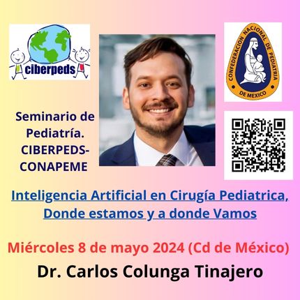 Estimado Pediatra Latinoamericano, lo invitamos a unirse al seminario web Zoom. Miércoles 8 mayo 2024 09:00 p. m. Ciudad de México. Inteligencia Artificial en Cirugía Pediátrica, Donde Estamos, por el Dr. Carlos Colunga Tinajero, Cirujano Pediatra de la Cd de Monterrey, N.L.
