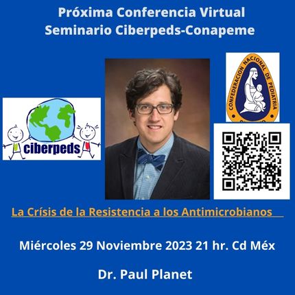 Estimado Pediatra Latinoamericano. Lo invitamos a unirse al seminario web Zoom. Miércoles 29 nov 2023 09:00 p. m. Ciudad de México. La Crísis de la Resistencia a los Antimicrobianos por el Dr. Paul Planet Infectólogo Pediatra del CHOP.