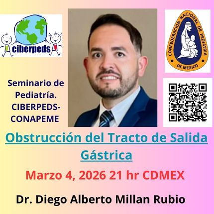 Estimado Pediatra Latinoamericano, Le invitamos a registrarse en un seminario de Ciberpeds-Conapeme. Miércoles 4 marzo 2026 09:00 p. m. Ciudad de México. Obstrucción del Tracto de Salida Gástrica, por el Dr. Diego Alberto Millan Rubio, Cirujano Pediatra de Cd Obregón Son.